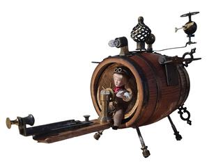 2024Een speelse assemblage van gevonden voorwerpen die samen een nieuwsgierige robot vormen.